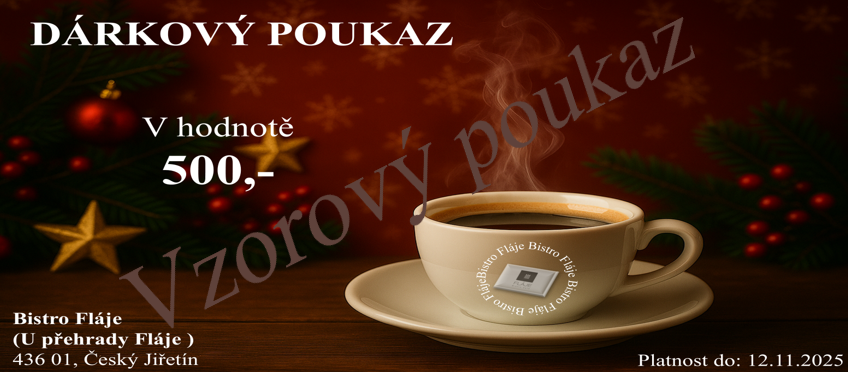 Na Vánoce jsme pro Vás připravili speciální vánoční dárkový poukaz v hodnotě 500kč a 1000kč, který je ideálním dárkem pro všechny, kteří milují dobré jídlo a příjemnou atmosféru. Tento poukaz je dostupný pouze během vánočního období a nabízíme ho v elektronické podobě, kterou Vám jednoduše zašleme e-mailem.