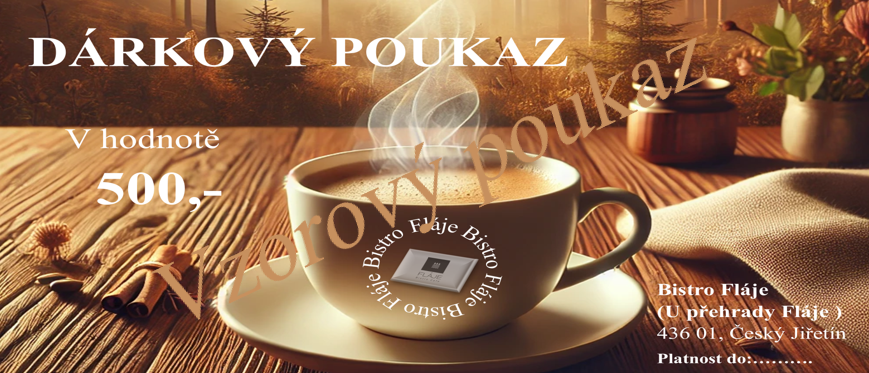 Nabízíme dárkové poukazy v hodnotě 500 Kč a 1000 Kč, které potěší každého milovníka dobrého jídla a příjemné atmosféry. Poukazy si můžete zakoupit u nás v Bistru v tištěné podobě či elektronicky.