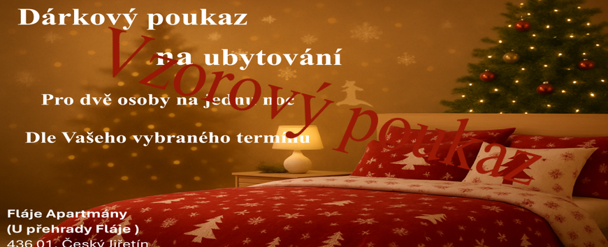 Hledáte originální dárek k Vánocům, kterým zaručeně uděláte radost? Nabízíme vánoční dárkové poukazy na ubytování v našem útulném apartmánu u přehrady Fláje, obklopeném krásnou horskou krajinou.